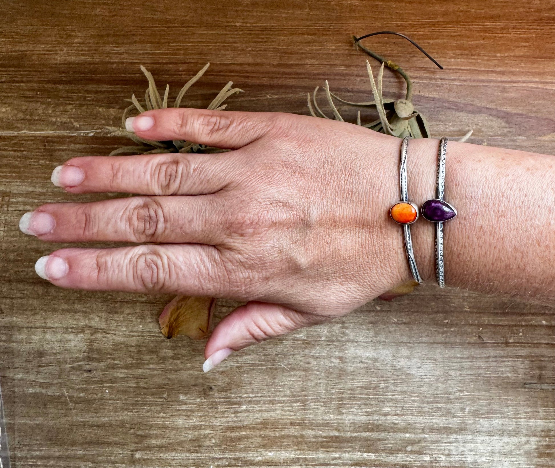 A bold pop of color in a sleek sterling silver cuff. These handcrafted beauties feature vibrant spiny oyster stones—choose between orange or purple. Each cuff is finished with a clean sterling silver stamp on the side and is Native made by G. Rios.