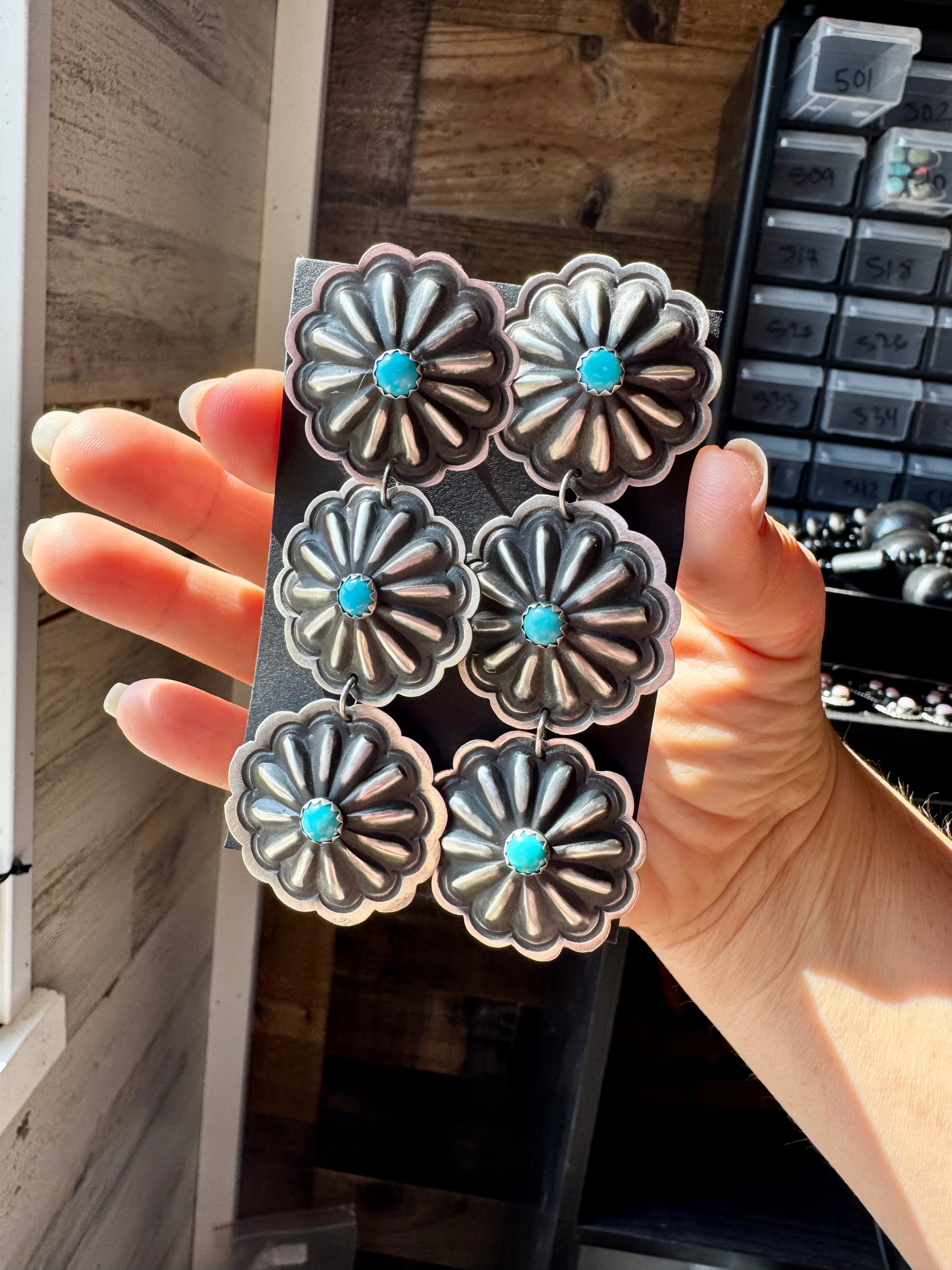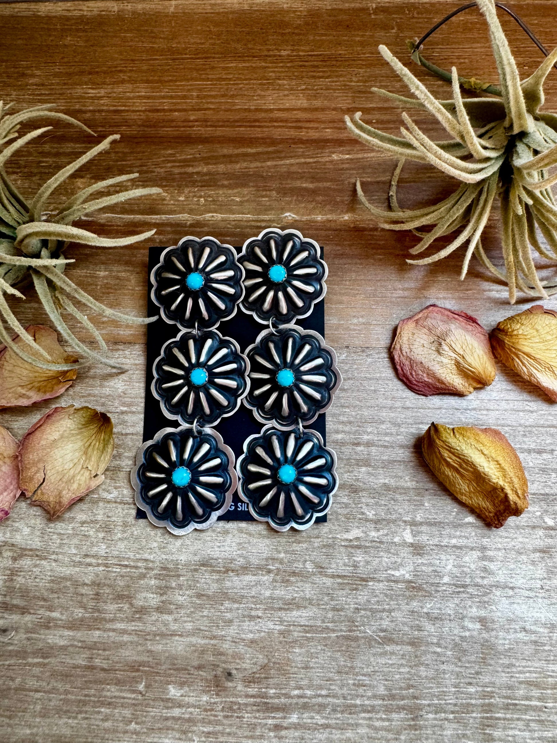 Triple Concho Dangle Earrings with Kingman Turquoise